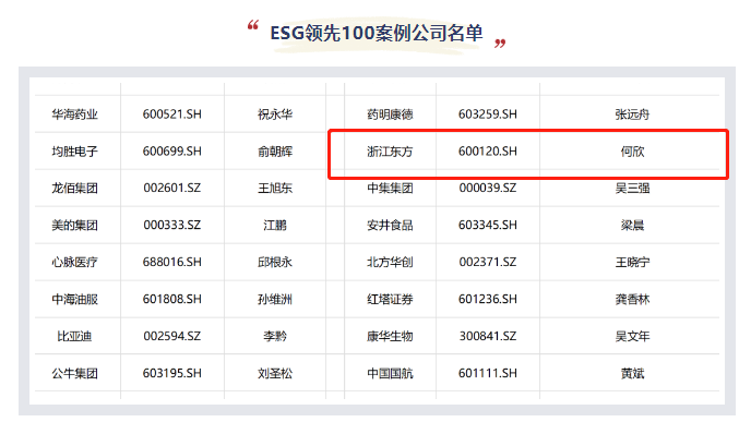 本屆論壇旨在推動(dòng)中國(guó)可持續(xù)投融資發(fā)展,進(jìn)一步探索ESG發(fā)展重要路徑,推動(dòng)金融與實(shí)體經(jīng)濟(jì)對(duì)接。論壇大會(huì)組委會(huì)在國(guó)內(nèi)ESG領(lǐng)域首次組織邀請(qǐng)政府監(jiān)管機(jī)構(gòu)、交易所、投資基等代表及證券分析師、投資專(zhuān)家、財(cái)經(jīng)記者等組成專(zhuān)家委員會(huì),建立完善的評(píng)審體系,推選出中國(guó)上市公司ESG領(lǐng)先100案例與中國(guó)上市公司ESG年度人物。浙江東方成功入選ESG領(lǐng)先100案例,未來(lái)將獲得國(guó)內(nèi)外ESG投資者更多的關(guān)注和青睞。
